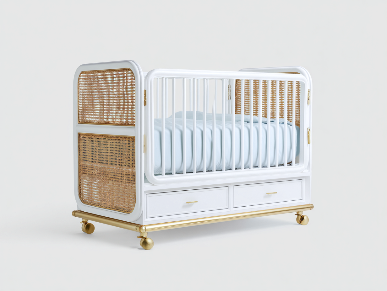 Culla in legno con pannelli in rattan - 128x66x96 cm - bianco e naturale - per cameretta - design moderno elegante