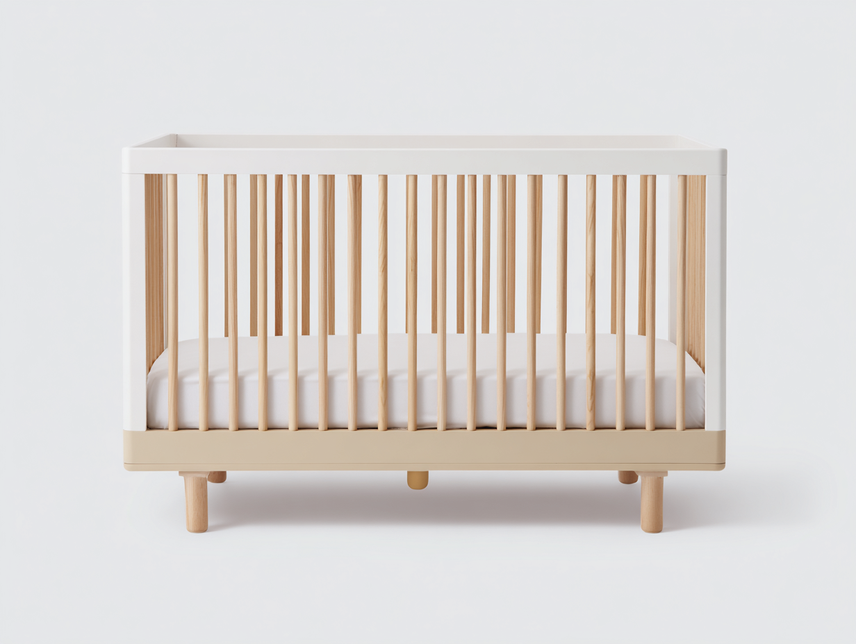 Questa culla in legno presenta un design moderno ispirato allo stile nordico, caratterizzato da linee pulite e colori neutri che si integrano facilmente nell'arredamento della cameretta. La combinazione di bianco e beige crea un aspetto luminoso e armonioso nello spazio domestico.