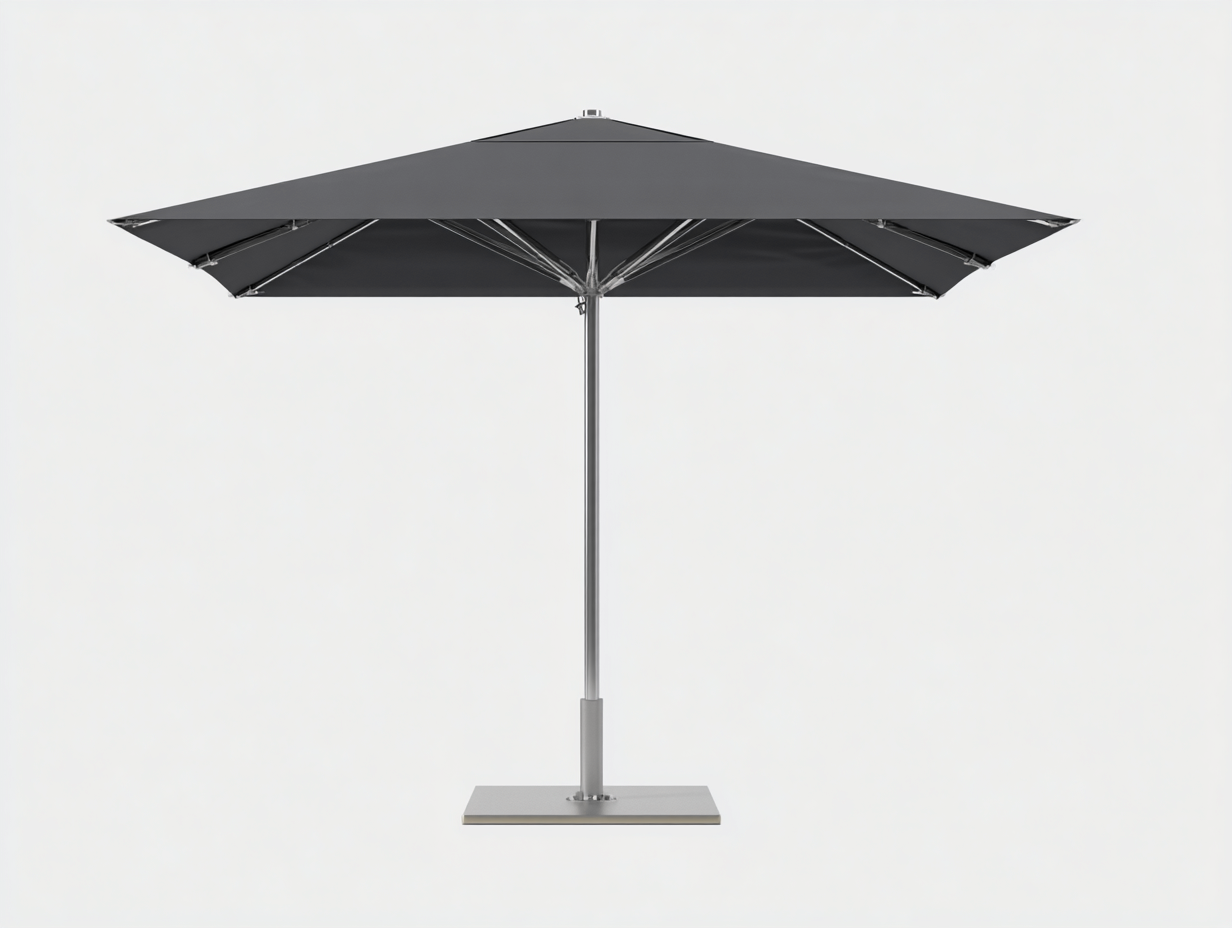 La struttura è composta da palo centrale in metallo con componenti resistenti progettati per l'utilizzo all'aperto. Il tessuto dell'ombrellone in tonalità grigio scuro offre protezione dalla luce solare e mantiene un aspetto sobrio e contemporaneo.